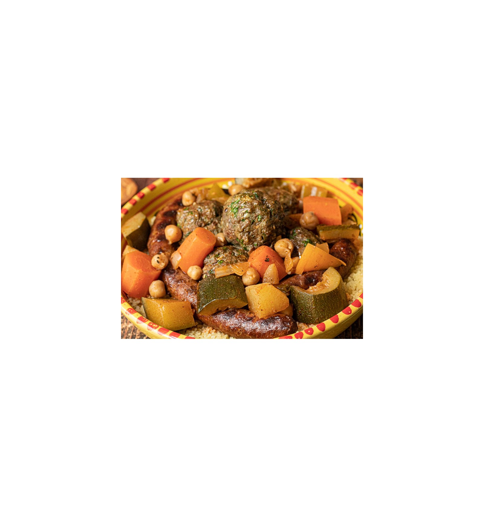 Boulettes de bœuf, poulet, légumes variés, pois chiches, épices et semoule.